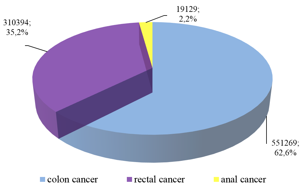 The number of died from this pathology in 2018 in the world amounted to 9 555 027 cases, while colorectal cancer (CIC) - 551 269 (62.6%); rectum cancer (CIC) - 310 394 (35.2%); anal canal cancer (AC) - 19 129 (2.2%) (Figure 4). With a breakdown by sex, the number of deaths from RTW among men was 484,224 (54.9%); and among women, 396,568 (45.0%), a ratio of 1.22:1.0 (Figure 5).