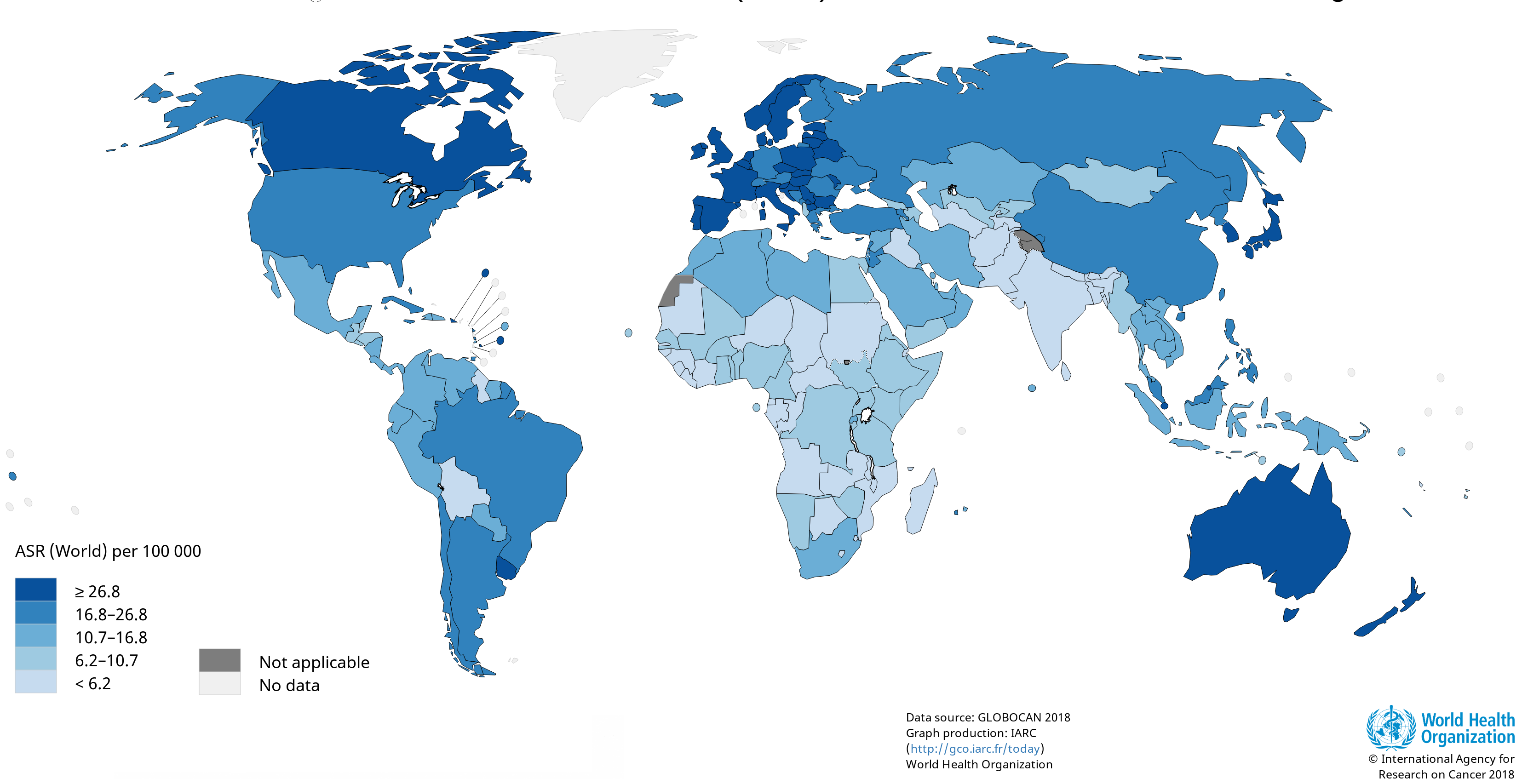 The highest level of DRD according to IARC is found in Australia, New Zealand, North America, Europe and Japan, apparently due to the impact of carcinogenic environmental factors as well as changes in lifestyle and nutrition patterns; low levels are found in Asia and Africa (India, Oman, Pakistan, Algeria, etc.), low rates may be due to the lack of and inability to provide timely diagnosis, as well as low economic and development capacity in these countries. According to Ferlay J & Parkin DM15–18 the analysis shows that in regions with high morbidity rates in different directions, there is a stabilization of morbidity rates in Europe and a decrease in North America, the ratio between ROC and rectum is 2:1, in North America, Australia and New Zealand, while in countries with low morbidity it is equalized to 1:1.19,20