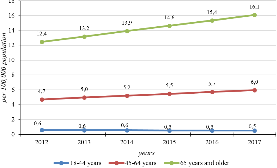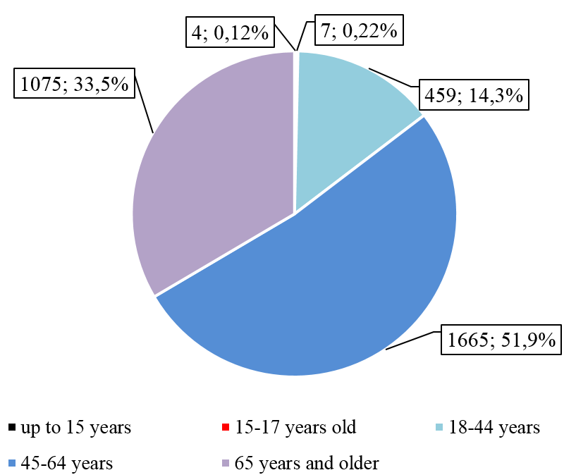 During the research period (2012-2017), 3210 patients were registered in the Republic of Uzbekistan for the first time in their lives with the diagnosis of ROC. The age breakdown of patients was as follows: up to 15years - 4 (0,12%), 15-17years - 7 (0,22%), 18-44 years - 459 (14,3%), 45-64 years - 1665 (51,9%), 65years and older - 1075 (33,5%) (Figure 9). As it can be seen from Figure 9, the specific weight of patients had unimodal growth with a peak at the age of 45-64years - 51.9%.