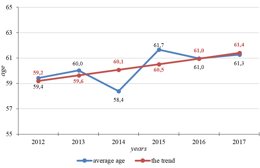 Figure 10 The dynamics of the middle age of patients with colon cancer in the Republic of Uzbekistan for 2012-2017yy.
