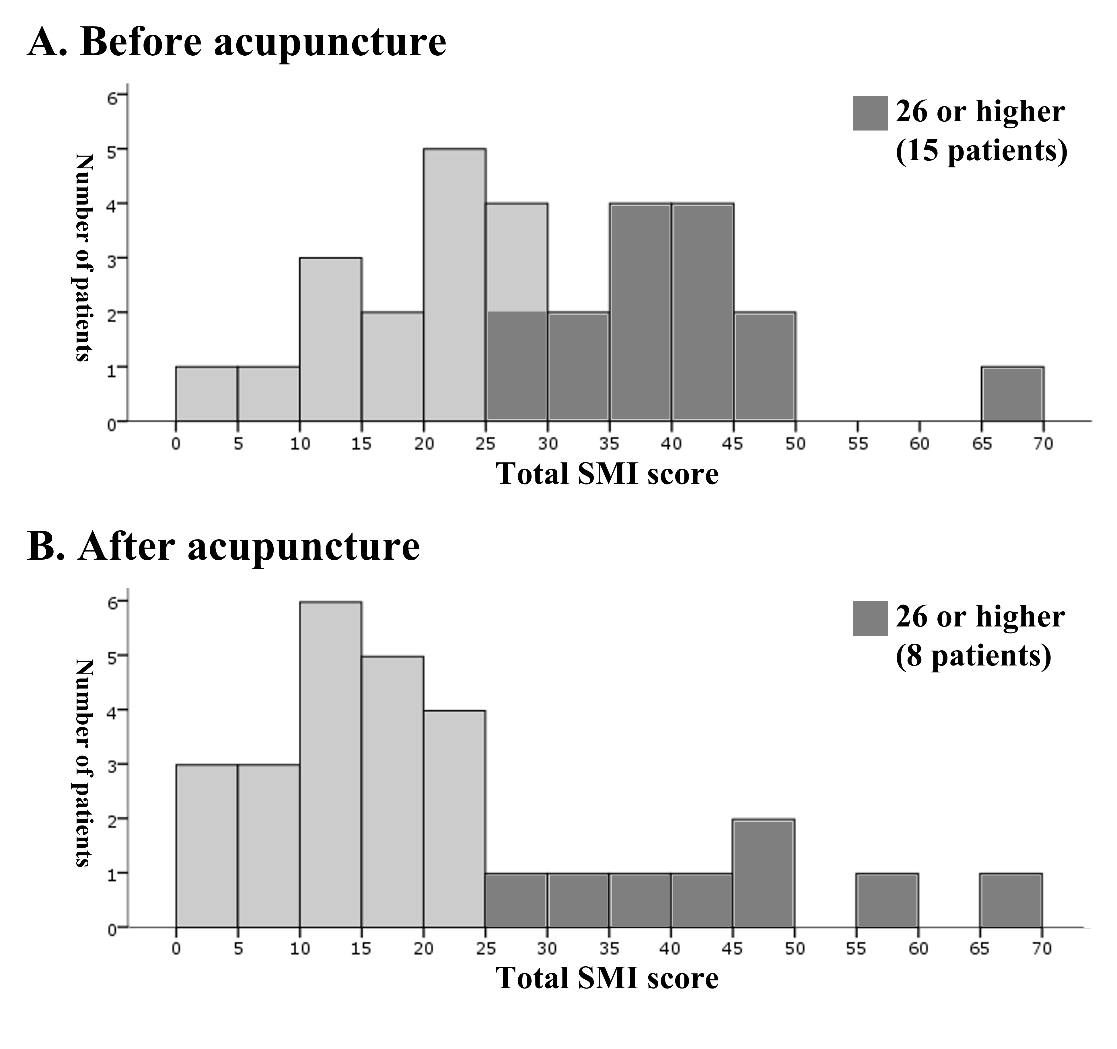 The mean time from the first visit to the fourth visit for 29 women was 6.9±3.0 weeks. Fifteen of 29 (52%) women had SMI subscale scores greater than or equal to 26. These participants were considered to have menopausal symptoms before the first acupuncture treatment. At the fourth visit before treatment, 7 (46.7%) of the 15 participants SMI scores reduced to below 26 (Figure 1), which is considered normal. For all 29 women, the mean (median)±SD SMI score of 28.8 (26)±14.2 before the first acupuncture treatment reduced significantly to 22.7 (18)±16.4 before the fourth acupuncture treatment (p=0.021). There was also a significant reduction in the SMI subscale score for the musculoskeletal symptoms category (p< 0.01). A significant increase in SMI scores was present in psychoneurological symptoms (p<0.01) and no significant change in the vasomotor symptoms was observed after the three acupuncture treatments (p=0.19) (Figure 2).