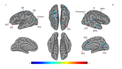 A significant decrease in right SIconnectivity was observed in bilateral superior frontal gyrus (SFG), superior temporal gyrus (STG), right SI, middle temporal gyrus (MTG), middle frontal gyrus (MFG), anterior cingulate cortex (ACC), posterior cingulate cortex (PCC), precuneus, left primary motor cortex (MI), inferior frontal gyrus (IFG), superior parietal lobule (SPL), cuneus (Figures 1 & Table 1). For left SI connectivity, a significant decrease was observed in bilateral middle occipital gyrus (MOG), IFG, STG, right middle cingulate cortex (MCC), middle frontal gyrus (MFG), and left MI, MTG (Figures 2 & Table 2).