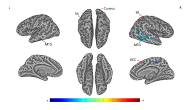 A significant difference of alterations in right SI connectivity between two study groups was observed in right PCC and right precuneus (Figures 3 & Table 3). For the alterations in left SI connectivity, the difference was observed in right MTG, secondary somatosensory cortex (SII), ACC, left MTG, cuneus (Figures 4 & Table 4).