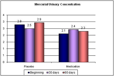 There was no statistically significant difference between average Hg urinary concentration values between the groups, not even between the rate standard deviations (p>0.05). However, there is evidence of increased Hg urinary excretion in the medication group around the 30thday of treatment, a tendency which decreased subsequently.