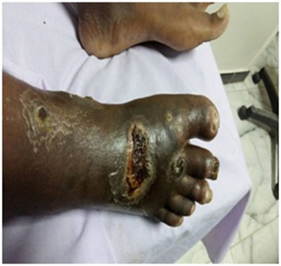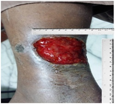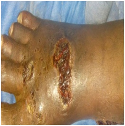 Patients were with an age span from 33 to 69years (mean 42.1years). The body mass index (BMI) varied from 27.8 to 38.2kg/m2 (mean 33.3kg/m2). The ulcer surface area was from 22cm2 to 80cm2 (mean 60cm2) with persistence time from 30weeks to 60weeks (mean 40weeks). In 4 patients, the ulcer was situated on the right leg and in 2 on the left one. The ulcer distribution was at tip of toes (5 ulcers), lower third of right calf (6 ulcers) (Figure 1) and dorsum of right foot (5 ulcers) (Figure 2), dorsum of left foot (2 ulcers) & at medial malleolus of right foot (2 ulcers) . Total number of ulcer treated was 20. Three patient were nearly unable to walk with severe deformities and degenerative changes of the small and large joints, 4 patients had ulnar deviation and flexion contracture of the fingers on the hands, all the patients had at least one debridement for their ulcers and all received antibiotics based on culture and sensitivity tests done by their surgeons, but currently at presenting none of them was on antibiotics.