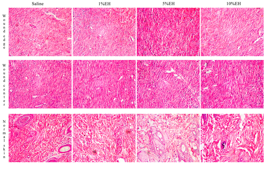 Figure 4 Photomicrograph of skin around the wound edges, wound center and normal skin from rats after 7 days of treatment with EH.