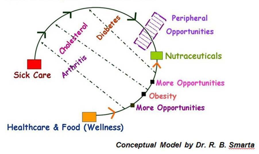 The present model of nutraceutical or medical food industry is pharma-driven. It emphasizes on the cure for diseases or ailments for their customers in the sick care sector. To be successful, the focus of the nutraceutical model will have to shift from illness to wellness domain (Figure 1) i.e., preventive and promotional aspects. In the nutraceuticals domain, peripheral opportunities are also exist for managing chronic lifestyle diseases and ailments. With the emergence of lifestyle-related diseases such as obesity, tuberculosis, diabetes, arthritis, malaria, and cholera, which can be managed through preventive efforts.
