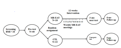 40 ninth grade adolescents (14 males; 35 African-Americans, 1 Caucasian, 4 Others; mean age 16.2±1.2yrs; BMI=32.4±9.0, BMI range 19.1 to 58.4) from 6 high school health/physical education classes were randomly assigned to 12-weekly sessions of MB-EAT-A intervention (n=18) or health education control (CTL, n=22). All subjects were in enrolled in health education or physical fitness classes at school. The MB-EAT-A group engaged in 50-min sessions at school each week for 3months (Figure 1). Primary outcome measures were changes in body weight, eating patterns, and eating and exercise behavior from pre-test to post-test at 3 mo. immediately following intervention and follow up at 6 mo. (3 mo. after intervention ended).
