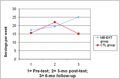 At six months, the MB-EAT-A group generally showed improvement in dietary/nutritional intake, increasing intake of healthier foods compared to decreases in the control group. These improvements were significant for overall intake of 7.7 more servings per week of lower calorie foods (p < .02), and 4.6 more servings of foods with low saturated fat (p < .02), and approached significance for servings per week of foods with no saturated fat (p < .10).