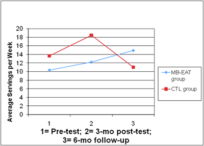 At 6-mo follow-up, the MB-EAT-A group increased 7.7 servings per week of low calorie foods compared to a slight decrease in CTLs. (p<.02, Figure 2). At 6-mo follow-up, the MB-EAT-A group increased 5.1 servings per week of foods with no saturated fat compared to a decrease in CTLs. (p<.10). At 6-mo follow-up, the MB-EAT-A group increased 4.6 servings per week of foods with low saturated fat compared to a decrease in CTLs. Change from baseline was +4.6 vs. -2.7 at 6-mo (p<.02, Figure 3). At 6-mo follow-up, the MB-EAT-A group increased 5.8 servings per week of foods low in fat compared to a decrease in CTLs. Change from baseline was +5.8 vs. –1.4 at 6-mo (p<.02, Figure 4).