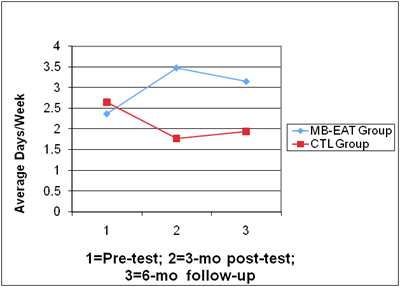 At 6-mo follow-up, the MB-EAT-A group increased days/week of aerobic exercise that makes one sweat or breathe hard (e.g., basketball, soccer, running swimming laps, fast bicycling, fast dancing >20min/day), relative to the control group. Change from baseline was 1.4 vs. -0.5 days/week, at 6-mo (p<.05, Figure 5). At 6-mo follow-up, the MB-EAT-A group increased days/week of moderate aerobic exercise >30 min/day that does not make one sweat or breathe hard. Change from baseline was 0.8 vs. -0.7 days/week, (p<.05, Figure 6).