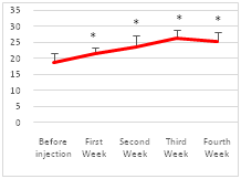 The leucogram revealed that TWBCs elevated significantly by the 4th week post intravenous infusion (Figure 6), where the percentages of lymphocytes (Figure 7) and monocytes (Figure 8) increased significantly by the 3rd week. Ingestion of daily honey solution increased total WBCs, lymphocytes41,66,69 and monocytes.41,66,70 In the present study, intravenous honey infusion decreased segmented cells (Figure 9) significantly by the 3rd week, while increased both band (Figure 10) and eosinophil cells (Figure 11) but not significantly.