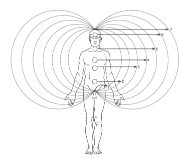 This article aims to explain scientifically that the aura is our emotional Spirit – aura (Spirit). A fertilized cell cannot develop unless the field of the Spirit is there to say what kind of emotional personality the future individual is going to be. The aura is weak nonlinear electromagnetic field (NEMF), which being nonlinear: 1/ does not dissipate, 2/ can imprint information, which makes the aura (Spirit) informational field, and 3/ has a chain of alternating vortices (spinning clockwise) and anti-vortices (spinning counterclockwise) along the backbone. They are called in ancient texts “chakras”, which in Sanskrit means “spinning wheels” (Figure 1). We have 7 such chakras along the backbone, and the 7th chakra on top of the head, sum up the energy of the 6 chakras under it. These 6 chakras rule and regulate the 6 glands of internal secretion. By secreting mg of hormones into the blood stream, these 6 glands rule and regulate everything in the body.