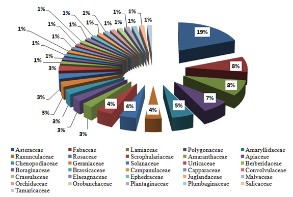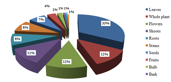The medicinal plants in Skuru watershed grow in the diverse range of habitats, such as valley plains, alpine pastures, rocky, dry slopes, boulders and alpine mountains. The Amchi system is totally dependent upon natural resources for the collection of plants and their parts.15 During the survey, 73 medicinal plant species belonging to 61 genera of 37 families from the area were recorded (Table 1). The uses of the collected medicinal plants for Acmchi medicine system were reviewed from secondary published sources. Asteraceae was the most dominant (19%) family with 14 plant species, followed by Fabaceae and Lamiaceae families (8%) with six species each. Polygonaceae was represented by five species (7%) and Amaryllidaceae by four species (5%). Ranunculaceae, Rosaceae and Scrophulariaceae were represented by three species each (4%). Amaranthaceae, Apiaceae, Chenopodiaceae Geraniaceae, Solanaceae and Utricaceae families were represented by 2 species each (3%). Remaining 17 families (Berberidaceae, Boraginaceae, Brassicaceae, Campanulaceae, Capparaceae, Convolvulaceae, Crassulaceae, Elaeagnaceae, Ephedraceae, Juglandaceae, Malvaceae, Orchidaceae, Orobanchaceae, Plantaginaceae, Plumbaginaceae, Salicaceae and Tamaricaceae) were monotypic (1%) used for traditional medicine system (Figure 2). The results of the present study revealed that from the recorded 73 species of medicinal plants, maximum (72.6%) plant species were used for ailments related to digestive system, followed by musculoskeletal (30.14%), respiratory system (27.4%) cardio-vascular system and blood related problems (24.66%), skin related problems (24.66%), renal system related problems (17.81%), nervous system (13.7%), gynaecological (10.96%) and men’s sexual health (5.48%). A bulk (45.21%) was used for other ailments (Table 2). Except for the seven plant species, all medicinal plants recorded were used for more than one ailment. The plant parts which were in maximum use for herbal medicines were leaves (33%) followed by whole plant (12%), flowers (12%), shoots (11%), roots (8%), stems (8%) seeds (7%), fruits (4%) bulbs (2%), bark (1%), rhizomes (1%) and tubers (1%) (Figure 3) Some of the most important medicinal plants photographs have also been given in Figure 4.