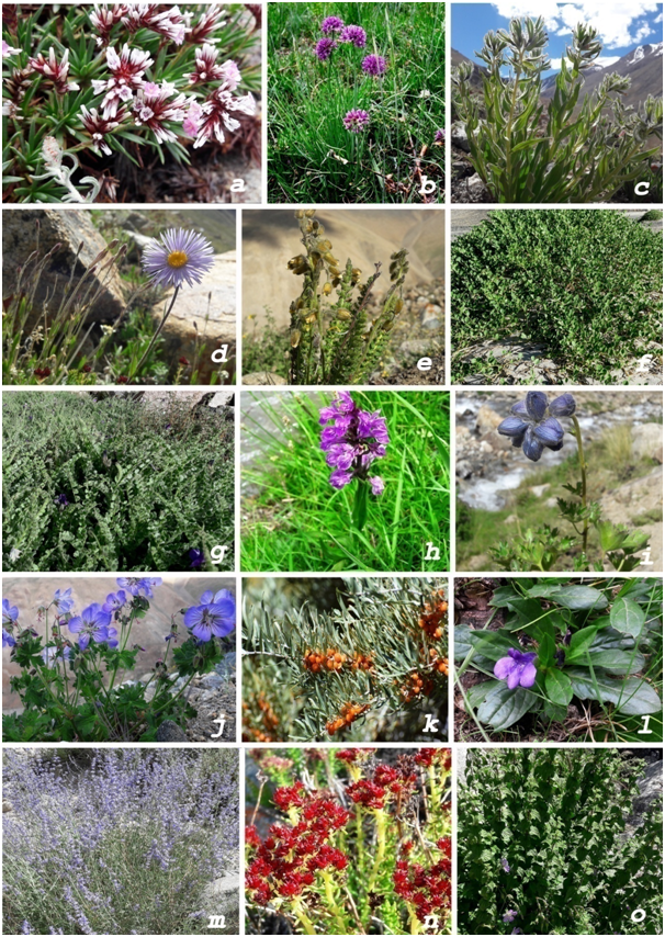 Figure 4 Medicinal plants: a. Acantholimon lycopodioides; b. Allium prezewalskianum; c. Arnebia euchroma; d. Aster tibeticus; e. Biebersteinia odora; f. Capparis spinosa; g. Cicer microphyllum; h. Dactylorhiza hatagirea; i. Delphinium brunonianum; j. Geranium pratense; k. Hippophae rhamnoides l. Lancea tibetica; m. Perovskia abrotanoides; n. Rhodiola tibetica; o. Urtica hyperborean.