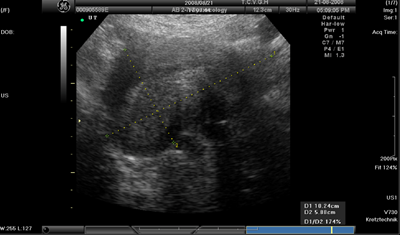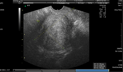 The method of intervention II was to first identify her greatest stressor and then let go of it, followed by intensive practice of mantra meditation, mindfulness meditation, and MBSR exercises, for approximately 4hours per day and approximately 28hours per week, while taking anti-inflammatory, haemostatic drugs, iron and vitamin B as necessary. The exercises of MBSR she did included mindfulness meditation, mind full breathing and body scan indoors, and mindful walking, mindful stretching in a large park with many big trees and beautiful lawn. Moreover, she practiced mindfulness in daily activities, paying attention to the present rather than the past or future, focusing on bodily sensations and movements and observing her thoughts none judgmentally. After 1.5month, her symptoms had markedly alleviated. The serum CA125 level, menstrual bleeding, and menstrual pain at this time are shown in Figure 2. The ultrasound graph is shown as Figure 4. The patient continued with the same meditation activities afterward, practicing approximately 2.5hours a day (for a total of about 17.5hours per week), and continued taking the same medication as necessary. Her symptoms had further improved as shown in Figure 2. In 2014, the patient had a large amount of menstrual bleeding in June, rare bleeding in July, and none in August. Her menopause was accurately diagnosed in December 2014. She had low-level bleeding twice in 2015, and non in 2016.
