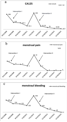 From the age of 45-50years (2008-2013), the patient had practiced mantra meditation and mindfulness meditation for approximately 45minutes per day and 4days per week, while taking the same medication as before. The general condition of adenomyosis was acceptable to the patient. Her serum CA-125 level and menstrual pain and bleeding are shown in Figure 2.