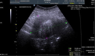 In the past, the diagnosis was dependent on histological evaluation of a hysterectomy specimen showing invasion of endometrial tissue into the myometrium,4 but recently transvaginal sonography, as well as the measurement of serum cancer antigen 125 (CA-125), a tumor marker, were adequate in clinically suspicious cases.5,6 The differential diagnosis nowadays was based on (A) severe menorrhagia, and dysmenorrhea, (B) serum CA-125 level ≧35.0 Unit/ml, (C) transvaginal sonography to show the diffuse uterine enlargement.7