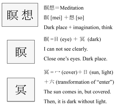As to the meditation, it was formerly evaluated to be religious or suspicious in the light of medical, psychosomatic and social points of view.10 However, such judgment has not been recently observed in our lives. It was because CAM has been developed and prevalent across the world.11 Meditation has been explained by Japanese and English languages (Figure 3), in which it can be understood from multi-cultural points of view.12