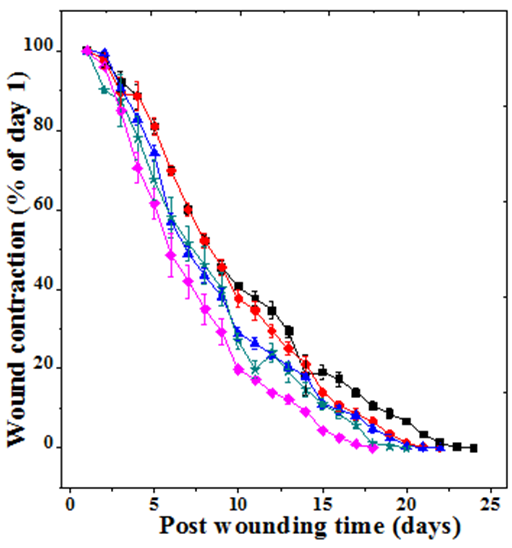 The full thickness deep dermal excision wound was created on the dorsum of mice as described earlier.18 Briefly, the fur of the dorsum of each animal was removed with a cordless electric mouse clipper (Wahl Clipper Corporation, Illinois, USA). The animals were anaesthetized using controlled anestheisa and the entire body was cleaned and decontaminated by wiping with 70 % ethanol. The cleared dorsal surface of the skin was marked with a sterile rectangular (2.5 x 1.5 cm) acrylic stencil. A full thickness dermal wound was created by excising the full thickness skin flap in an aseptic environment under a vertical laminar flow apparatus using sterile forceps and scissors. Each wounded animal was housed in a separate sterile polypropylene cage until the termination of experiments. The following studies were carried out:–
