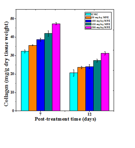 The synthesis of collagen increased in a dose dependent manner on both day 7 and 12 post wounding (Figure 3). The lowest but significant (p<0.01) increase was recorded on day 7 post wounding in the mice treated with 50mg/kg b. wt. MPE. With increasing dose, the synthesis of neocollagen also increased and a maximum rise in collagen synthesis was observed for the 200mg/kg b. wt. MPE on day 7 post wounding (Figure 3). The estimation of collagen synthesis on 12 day post wounding showed a decline in the rate of collagen synthesis when compared to day 7 and significant increases were only observed for 150 and 200 mg/kg MPE (Table 1).