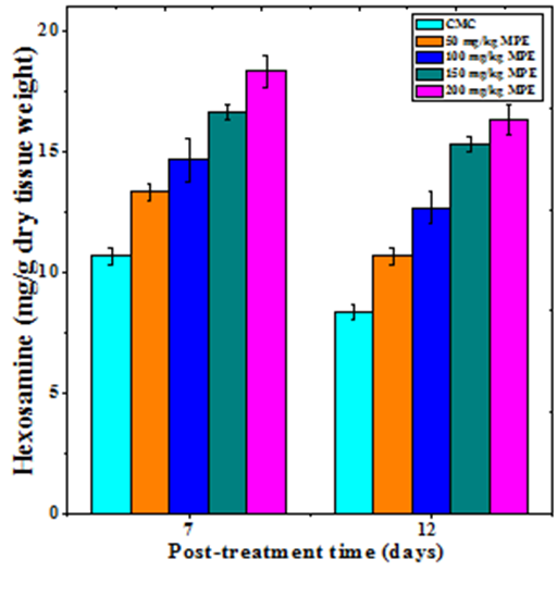 Hexosamine synthesis in the regenerating wound also increased in dose dependent manner on both day 7 and 12 post wounding (Figure 4). The treatment of mice with different doses of MPE caused a significant rise in the hexosamine synthesis on both day 7 and 12 posts wounding (Table 1). The hexosamine synthesis declined with time and the rate of hexosamine synthesis was lower on day 12 when compared to day 7 post wounding (Figure 4). A maximum syhtesis of hexosamine was recorded for 200 mg/kg MPE on both day 7 and 12 post wounding (Figure 4).