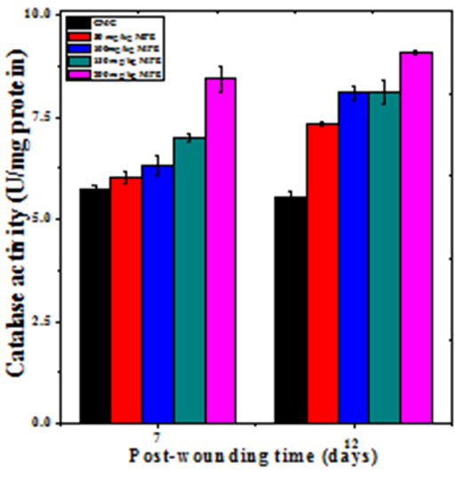 Figure 8 Effect of different doses of ethanol extract of Mimosa pudica on the catalase activity at different post wounding days in mice inflicted with deep dermal excision wound.