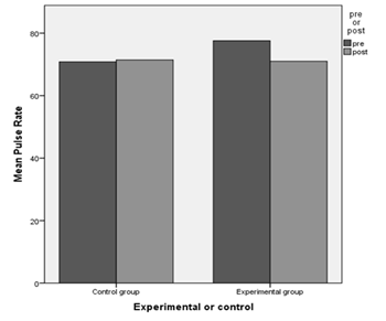 Physiological measurement: Nurses measured their own pulses in order to evaluate the relaxation response. The determination was made that the nurse could record their own pulses secondary to the expertise they have in this area. Each nurse was queried as to their ability to read their own pulse and was instructed to come to each session with a wrist watch. The approach was standardized by having each nurse locate their pulse using the radical artery on the wrist and using index and middle fingers together for measurement.
