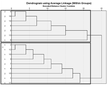 The treatment x week x measurement interaction was also significant (p=.005) which was due to the unit lounge group showing almost no change by week 4. On the Trait scale and the POMS, the treatment x measurement interactions were less marked (p=.063 and p=.16, respectively). However, in the case of the POMS, the post scores on the Confusion-Bewilderment sub-scale were consistently lower in the MSET group (p=.004). After controlling for confused – bewilderment pre score, the difference between the groups on the post measurement was still significant (p=.01). Therefore it can be concluded that there is a significant difference between lounge (control) and MSET (experimental) group when all measurements were taken and when pulse and State Anxiety was measured. Cluster analysis was carried out to see if the measurements obtained divided the participants into control and experimental groups. Before the analysis was carried out new variables were created with contained the difference in pre/post scores for each of the 8 sessions. This analysis produced a dendrogram which shows how the participants can be split based on their measurements. To produce this, the within groups cluster method was used with the Euclidean distance.