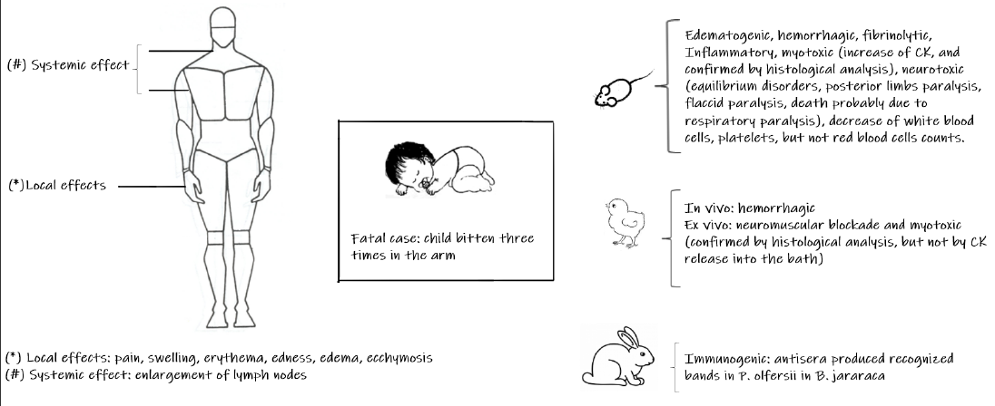 The knowledge of envenomation induced by P. olfersii described in the literature is summarized in Figure 3, showing the state of the art either in humans as in animals.
