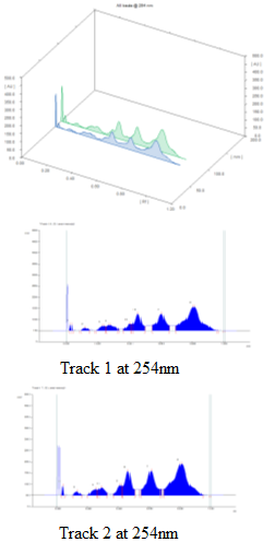 The chromatogram at 366nm Figure 2 shows the presence of 5 and 9 peaks of ranging from 0.01-0.82 & 0.01-0.82 with the major areas occupied at 37.36% &30.83% for tracks 1 & 2 respectively.