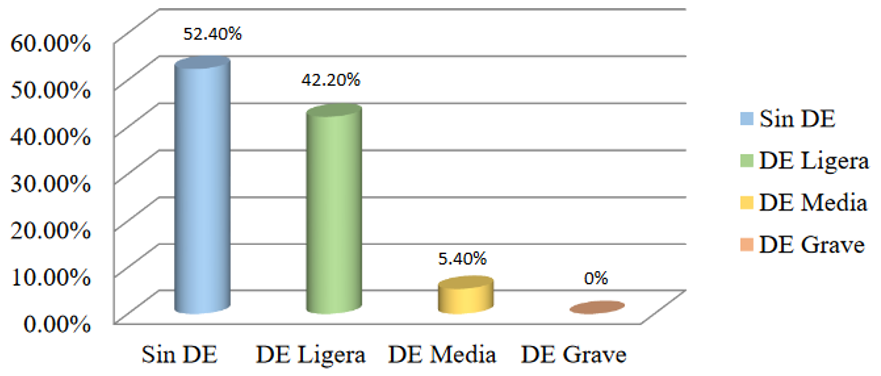 Regarding the relationship between erectile dysfunction and depression in the present research study, depression was present in 38.40% of the population, where the relationship between ED and mild depression predominated in 26.20% followed by moderate depression in 11.70% and only 0.5% presented severe depression. On the other hand, Tesfay Gebremedhin H et al.,27 in a study of 802 patients aged 18 to 60 years in the city of Adigraf in Ethiopia, found depression in 9.7% of the participants, being different from our study, possibly due to the association of chronic diseases and overweight, which decreases the quality of life and where depression is more prevalent. Yu Han F et al.,28 in a study of 1740 Taiwanese men aged between 20 and 40 years, with a diagnosis of erectile dysfunction, found an association between symptoms of depression and erectile dysfunction, where 15.9% of men had moderate depression and 54.1% had severe depression, being more prevalent in those patients with moderate or severe erectile dysfunction, results similar to those of this research, where an association proportional to the degree of erectile dysfunction with the degree of depression was also found.