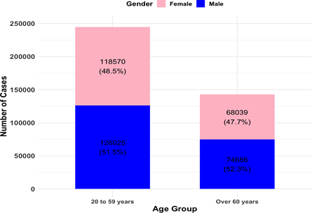 Figure 5 demonstrates a distinct gender disparity in hospitalizations and mortality due to lower limb circulatory diseases. Females aged 20 to 59 years had the highest hospitalization rates, yet exhibited the lowest mortality rates, suggesting better clinical outcomes despite a higher disease burden. Conversely, male patients in the same age group had fewer hospitalizations but a greater number of deaths, indicating a more severe disease progression or delays in seeking medical care. A similar trend was observed in the over 60-year-old group, where males had slightly lower hospitalization rates but experienced higher mortality compared to females. These findings highlight the need for targeted preventive strategies, particularly for male patients, to reduce the risk of severe complications and fatal outcomes associated with circulatory diseases affecting the lower limbs.