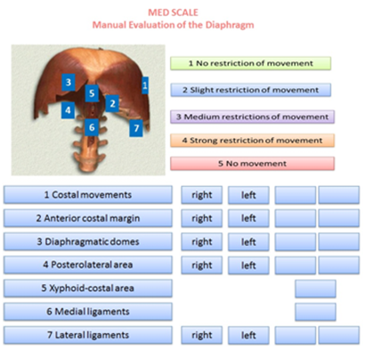 MED Scale is a new proposal for manual evaluation for diaphragm muscle, the only one currently existing in the scientific literature. The main purpose of this manual assessment is to understand whether there is a restriction of movement in a specific area of the diaphragm, and to effectively plan a manual treatment focused on the dysfunctional area by combining the manual approach to the conventional rehabilitation process. Having the possibility of obtaining a common exchange of information through this scale should speed up decision-making among different professional figures.