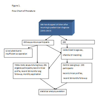 Ethics Committee approval granted, and the study performed in agreement with the Declaration of Helsinki. All the recruited small patients went under complex personal rehabilitation program using the Hungarian standard rehabilitation protocol for infantile CP. Two hundred ninety-three (293) of the small patients received additional permanent acupuncture therapy using the embedding acupuncture method, and these children were regarded as the acupuncture group. The other 293 children without acupuncture therapy regarded as the control group; they only received necessary rehabilitation therapies (according to Pethő, Bobath, HRG methods, as early neuro-developmental exercises. The average age was 1,3-3.4 and 1-3,9years (in the acupuncture and control group, respectively).