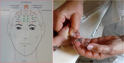 YNSA is not a ”ready-made’’ acupuncture form (no advised prescription or receipt for one disease) , but rather a treatment tailored to the individual sensitivity areas of the patient.15,16,17 The small patients in the acupuncture group had been treated once in each month during the whole period of the course of the clinical trial using the dry needling method with removable dry needles according to YNSA (Figure 3). The absorbent monofilaments served as ‘’time release’’ dry needling system with the inserted and permanently entered insertion.18 The length of handmade the special stainless-steel needle is cca. 8cm, and the diameter of the lumen is 0.1mm. The threads (MAXOL-M Monofilamentum, Johnson and Johnson, USA) cut into 0,7-1cm pieces and then applied with the special needle. The threads placed into the lumen of this needle, and the material applied to the selected‚ by well-skilled acupuncturists. Altogether 14 “needles” were inserted into every subject per session. The depth of thread insertion is 0, 7-0.9mm. There was no other needle manipulation performed. The insertions of embedding method were applied once a month, based on the total absorption time of the previous threads being four weeks according to our previous studies. Embedded filaments stimulated the following YNSA points (Cerebrum, Cerebellum, Basal Ganglia, Liver on the skull contralateral)19 and additionally bilaterally Kidney SHU back point (UB 23), St 36 (Zusanli), LI 4, LI 11, GB 34 bilaterally. The children with CP in the control group had not been treated by any form of acupuncture, but physiotherapy - developing exercises in our department, -as in many rehabilitation centers in Hungary-, for stroke and infantile CP rehabilitation were applied. The difficulty on the Pethő, Bobath method in an attempt to achieve normal movement and improve strength. Each patient of selected children received certain modalities of treatment (3times a week) as decided by the supervising neurologist doctors and senior physiotherapist according to the patient’s need at different stages of recovery. The Bobath couple method contributes to the prevention and correction of formation and muscle strength decrease of deformities, which help provide a variety of tools, pads, rollers, supports, assisting specially trained investing, straddle seating, chairs, righting, helping position adjusters, balls, shafts, balancing boards, pylons, rails, shoes, helping walking, walkers, and wheelchairs.
