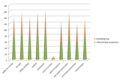 Results: In the permanent acupuncture group (combined YNSA and body acupuncture) all the sensory, motor and functional scores improved significantly during the examination period until 5years after birth. A significant development during the 2-year follow-up was found due to developmental behavior pediatrician activity and special daily performed moving exercices, but the embedding acupuncture with YNSA and some important body points (they are motoric trigger points of muscles) treatment facilitated the mental and functional development. Improved moving and mental function, more flexible joints and ligaments were observed in comparison to the small patients’ condition prior to treatment. The number of seizures decreased, the reduction of antiepileptic drugs was possible, which resulted an elevated mental vigility. Statistical analyses showed significant improvement in Barthel index.