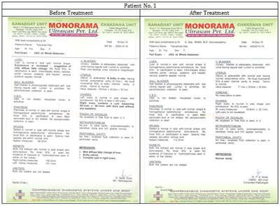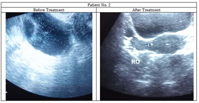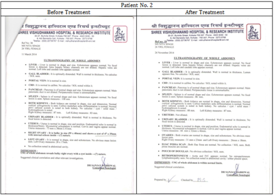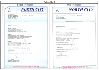 The common general symptoms of all the three patients as well as minor individual deviations have been mentioned in Tables 2-4 for the three patients. All of them were confirmed cases of bearing large single cysts located in right ovary. They visited the clinic mainly with a complaint of nagging pain in the right abdominal region and some menstrual problem. They were first advised to perform trans-ovarian ultra-sonography (USG) at the earliest which they complied with. USG reports confirmed presence of large sized cysts in all of them.