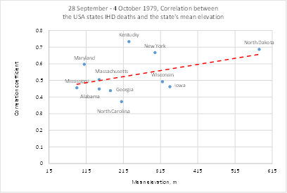 Figure 5 Dependence of the correlation coefficient between the number of IHD deaths and mean altitude for some states with a positive correlation coefficient. The increasing trend with altitude indicates that the threat of IHD increases with elevation above sea level.
