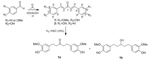 Compounds1and 2(Scheme 1) were obtained by aldol condensation in acidic conditions, as previously reported.6 Briefly, a mixture of acetone (580mg, 10mmol) and vanillin(20mmol) for compound 1 or 4-hidroxy-benzaldehyde (20mmol) for 2was slowly added to acetic acid (50mL) saturated with hydrogen chloride at O oC. The reaction mixture was stirred at room temperature for 24h. Next, the crude reaction mixture was poured into ice-cold water (200mL) and then extracted with ethyl acetate (3x30mL). After drying the organic portion over MgSO4, filtration, and solvent removal under reduced pressure, the resulting solid was purified using silica gel flash column chromatography using hexane: ethyl acetate 1:1 (v/v) (Figure 1). Compounds 1aand1b were obtained from 1 by catalytic hydrogenation. In this procedure, compound 1 dissolved in HPLC grade ethyl acetate was added to a high-pressure reactor together with Pd/C (10%) and kept at room temperature under stirring, H2 atmosphere, and pressure of 100 psi for 18h.7 Chemical structures of compounds 1, 1a, 1b, and 2a were confirmed on the basis of NMR, IR, and MS analyses.