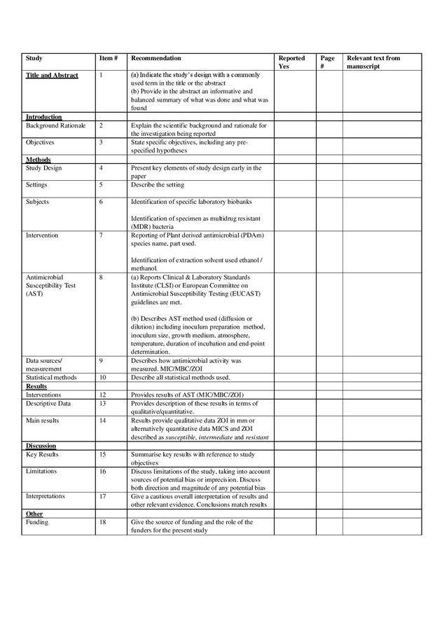 Further limitations are that a double screening selection process is generally recommended to enable the uncertainty to be quantified with more confidence and to eliminate bias. Whilst CLSI/ EUCAST have standardised AST procedures there can be no absolute surety that comparisons are meaningful. This research would benefit by expanding search criteria to include plant bioactive compounds and alternative solvents.