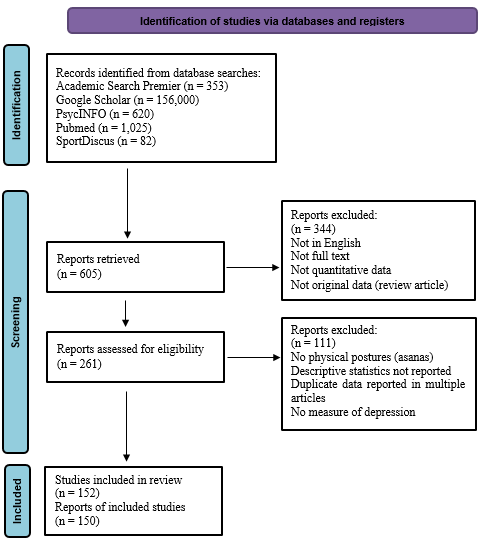 The following electronic databases were searched to find published and nonpublished studies: Academic Search Premier, Google Scholar, PsycINFO, PubMed, and SportDiscus. The following key terms were used: yoga, yoga therapy, yoga intervention, depression. Studies were also located through a process of backward searching (i.e., using references of articles to track down older studies) and forward searching (i.e., entering the citation for an article into Google Scholar and selecting “as cited by” to locate newer studies). The search ended on January 31st of 2022.