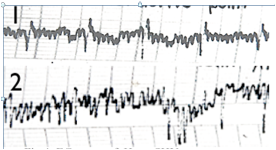 Figure 4 EG traces of Heart SHU acupuncture points (B115): 1: Healthy person; 2: Patient with cardiac arrhythmias.