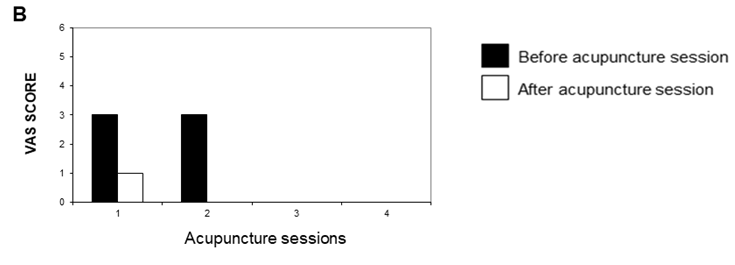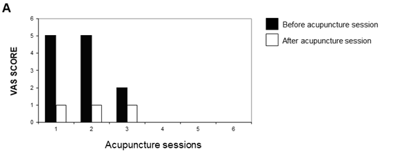 At presentation in our UIM, the main symptoms consisted of unilateral (left) midfacial pain described as dull and oppressive, not pulsating, lasting hours to days and frequent relapses, with hyperalgesia of the left zygomatic region, sense of foreign body in the left nasal fossa and nasal obstruction. Pain become exacerbated in the last year with over-imposed intermittent episodes of burning or stabbing sensation lasting seconds to hours, reaching a VAS score of 10 in the acute phase. The neurological examination pointed out a reduction in superficial and deep sensitivity. Symptoms and signs were consistent with a neuropathic pain, by involvement of the second (maxillary) trigeminal branch. The planned treatment consisted of weekly sessions of Traditional Chinese Medicine acupuncture and auriculotherapy lasting 30minutes each. Disposable stainless steel needles (ø 0,25 x 13mm; 0,25 x 25mm, Hwato, China) were inserted into the skin by a more than 30years experience acupuncturist and when appropriate manipulated for not longer than 1minute; the depth of needle insertion varied according to the site (face and ear 0.3-0.5 cun; hand and leg 0.5-2 cun). Unilateral (left) points chosen for the first session: EX-NH3 (Yintang), EX-NH8 (Bitong), EX-NH5 (Taiyang), 1BL, 18SI, 8ST, 4LI. Before the first session and at the end of the treatment the patient filled the short form health survey SF-12 questionnaire, and every session before and after the acupuncture treatment the patient reported the VAS score. Having achieved almost complete relief from the symptoms by the end of the first session, reaching a VAS score of 1 starting from 5 (Figure 1A), following treatments focused on consolidation of these results. In the following sessions, points selection included left unilateral EX-NH3, EX-NH8, EX-NH5, 1UB, 18SI, 8ST, LI4, ST36, and left unilateral auriculotherapy: Thalamus point or Subcortex (MA-AT2), Lung (MA-IC1), ear Shen Men (MA-TF 1), Stomach (MA-IC 6), Face (LO-5). No adverse events were reported. After five sessions the patient had been symptoms-free for the last two weeks, without need of pharmacological treatment and reaching a VAS score of 0. Hence he has been discharged (Figure 1A). Quality of life evaluation with the SF-12 questionnaire showed a slight improvement of the physical score (from 49.16 to 53.11), while the mental score has changed from 33.76 to 29.61. Results were consistent at ten weeks follow up.