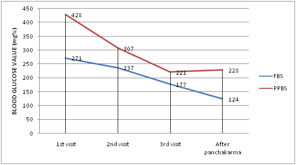 The patient was prescribed classical Prameha hara (anti-diabetic) formulations and was advised to visit for review after one month. The physical symptoms, FBS and PPBS were effectively controlled with medications and he continued this for three months. However, even on the third monthly review no significant change was observed in the HbA1c. The patient was admitted in IPD and an Ayurveda panchakarma protocol including Abhyanga, Takra dhara and Yoga vasthi with a total duration of 8 days was administered. At the end of the therapy HbA1c was observed to be significantly improved from 12.5% to 10.6%.