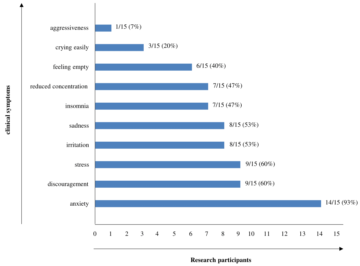 Concerning the symptoms reported by participants, there were at least two of the following symptoms described by participants, among which anxiety was the most frequent symptom (14/15 = 93%), followed by discouragement (9/15= 60%), stress (9/15=60%), irritation (8/15=53%), sadness (8/15=53%), insomnia (7/15=47%), reduced concentration (7/15=47%), feeling of emptiness (6/15=40%), crying easily (3/15=20%) and aggressiveness (1/15=7%) (Figure 1).