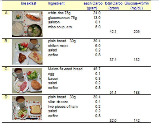 The case has checked the picture of actual breakfast and also 45-min post-prandial blood glucose after breakfast. Among them, four representative data are shown in Table 1, which clarified the detail carbohydrate amount in the foodstuff and blood glucose levels. In Table 1, carbohydrate amount in breakfast varies from 32.0 g to 51.1g, and 45-min post-prandial blood glucose distribute 132mg/dL to 205mg/dL. His lifestyle is stable and morning situation is always same around the breakfast.
