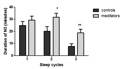Figure 1 Shows that duration of N3 is significantly high in meditators during second and third sleep cycle when compared to controls. *p<0.05, **p<0.001.