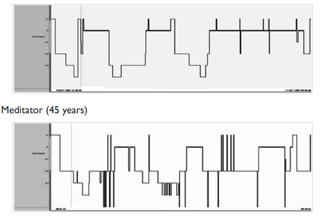 Figure 3 Shows representative hypnograpm of a meditator and control of 45 years of age. Meditator shows increase in N3 and REM sleep stage with less intermittent awakenings than that of controls.