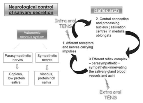 The postulated theory suggests that extraoral TENS placed over the parotid gland directly stimulates the auriculotemporal nerve that supplies secretomotor drive to the parotid gland. It is believed that afferent nerves carry such impulses to the salivary nuclei (salivation center) in the medulla oblongata which in turn directs signals to the efferent part of the reflex leading to initiation of salivation (Figure 1).25,26 Whereas the intraoral TENS stimulates the oral mucosa on afferent neuronal receptors and pathways thereby increasing salivary production.23,24 To get copious watery saliva, higher frequencies and longer pulse duration is required which stimulate sympathetic salivation nerves, whereas lower frequency can stimulate the parasympathetic nerves which produces voluminous serous saliva.27,28